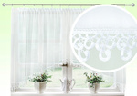 Gotowa biała firana na taśmie marszczącej wieszana na żabki lub agrafki wycięta w łuk z delikatnego woalu wykończona ozdobną gipiurą angielką z siateczką szer. 400x150 wys.